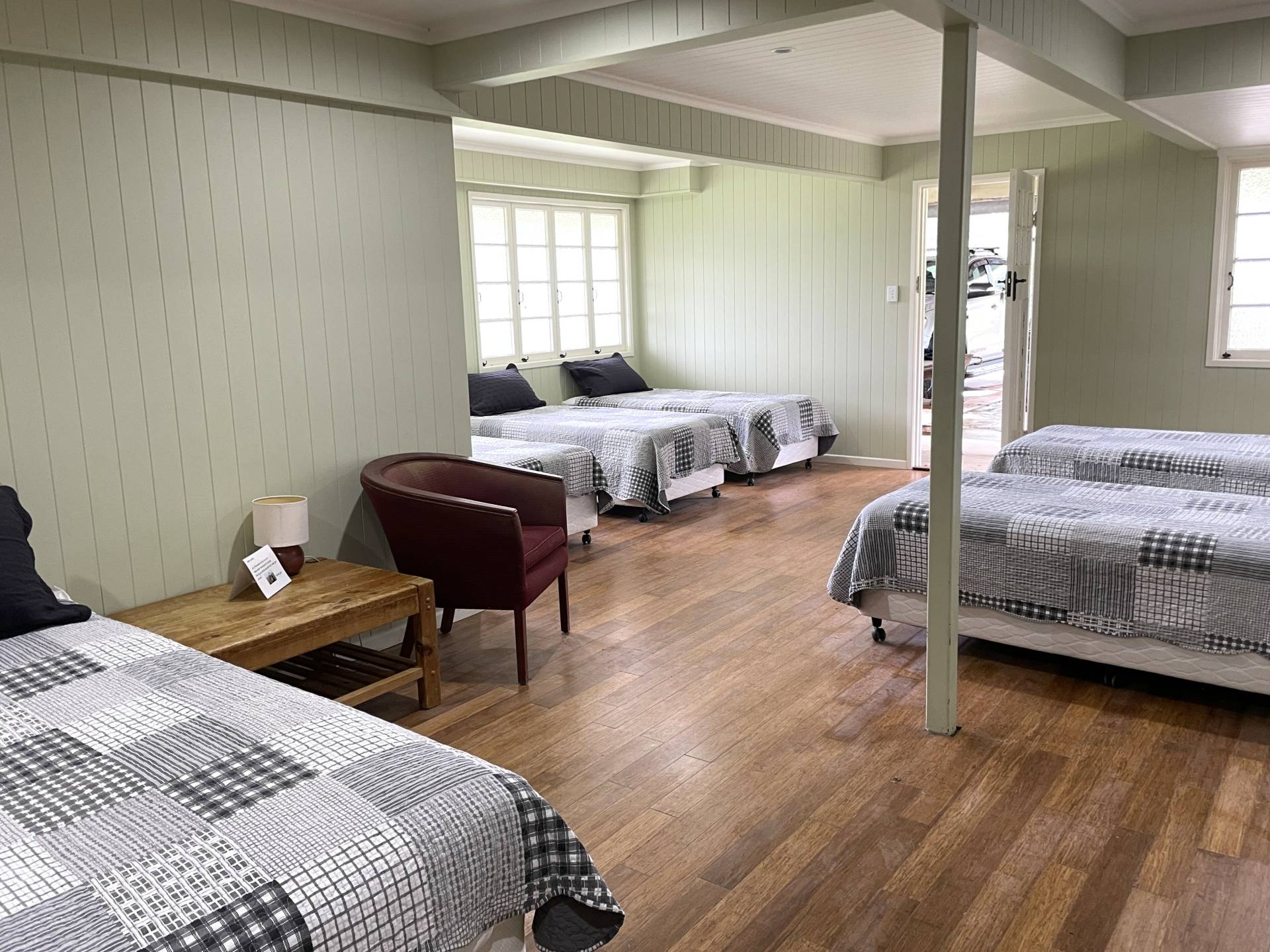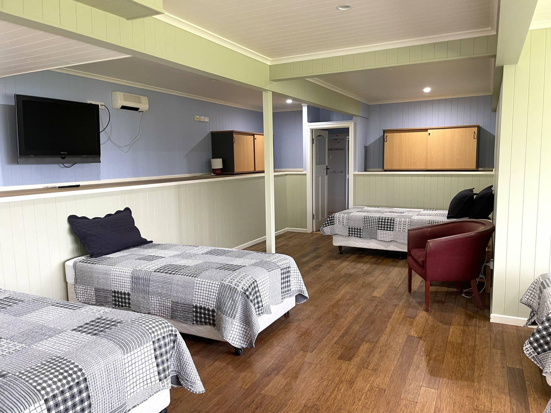 This room is currently set up with 6 single beds and lounge area and has good storage