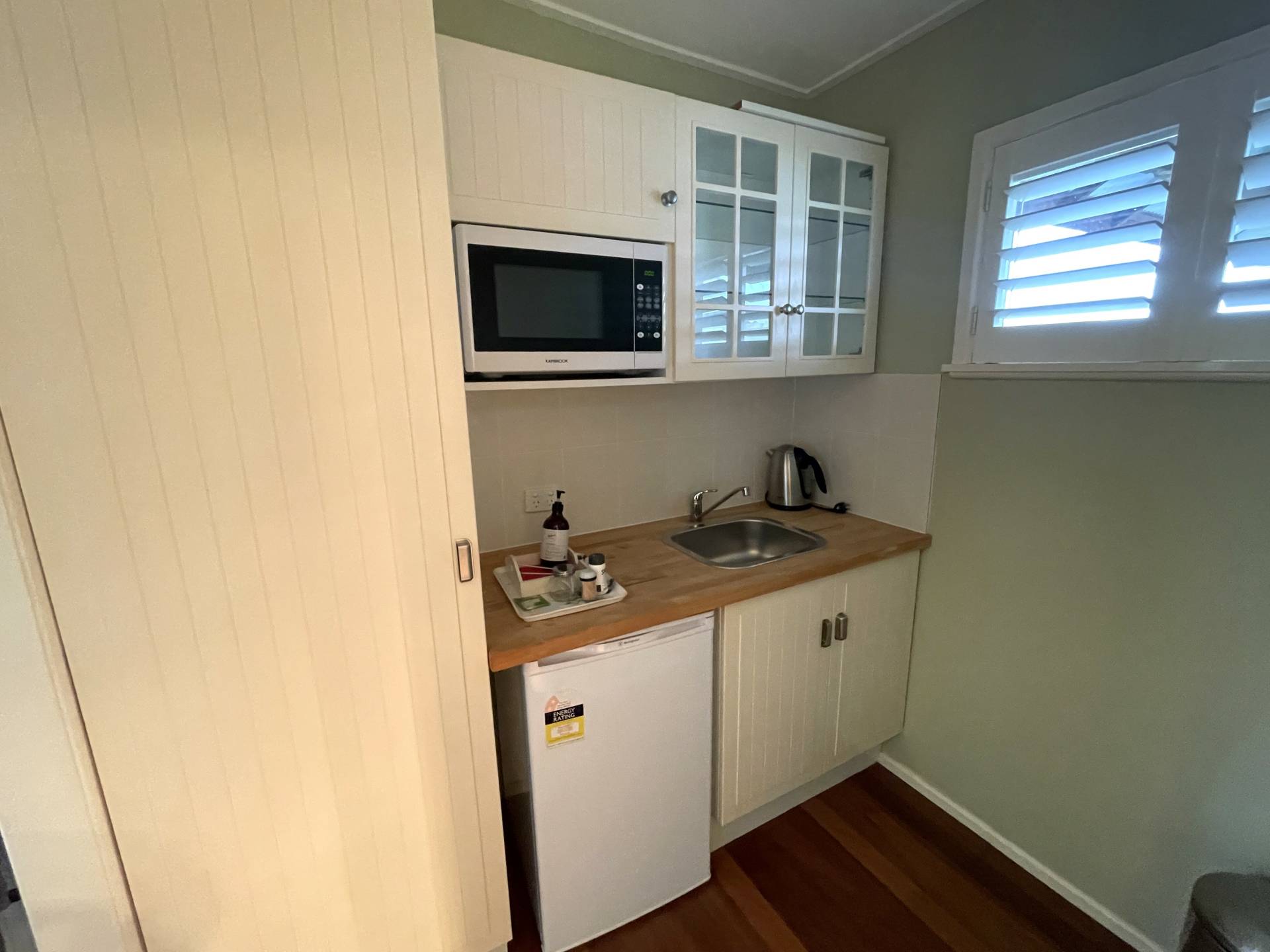 • Central kitchen with timber benches and stainless steel cooking appliances