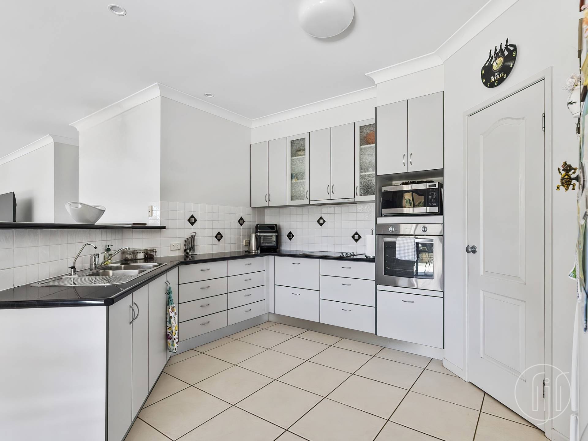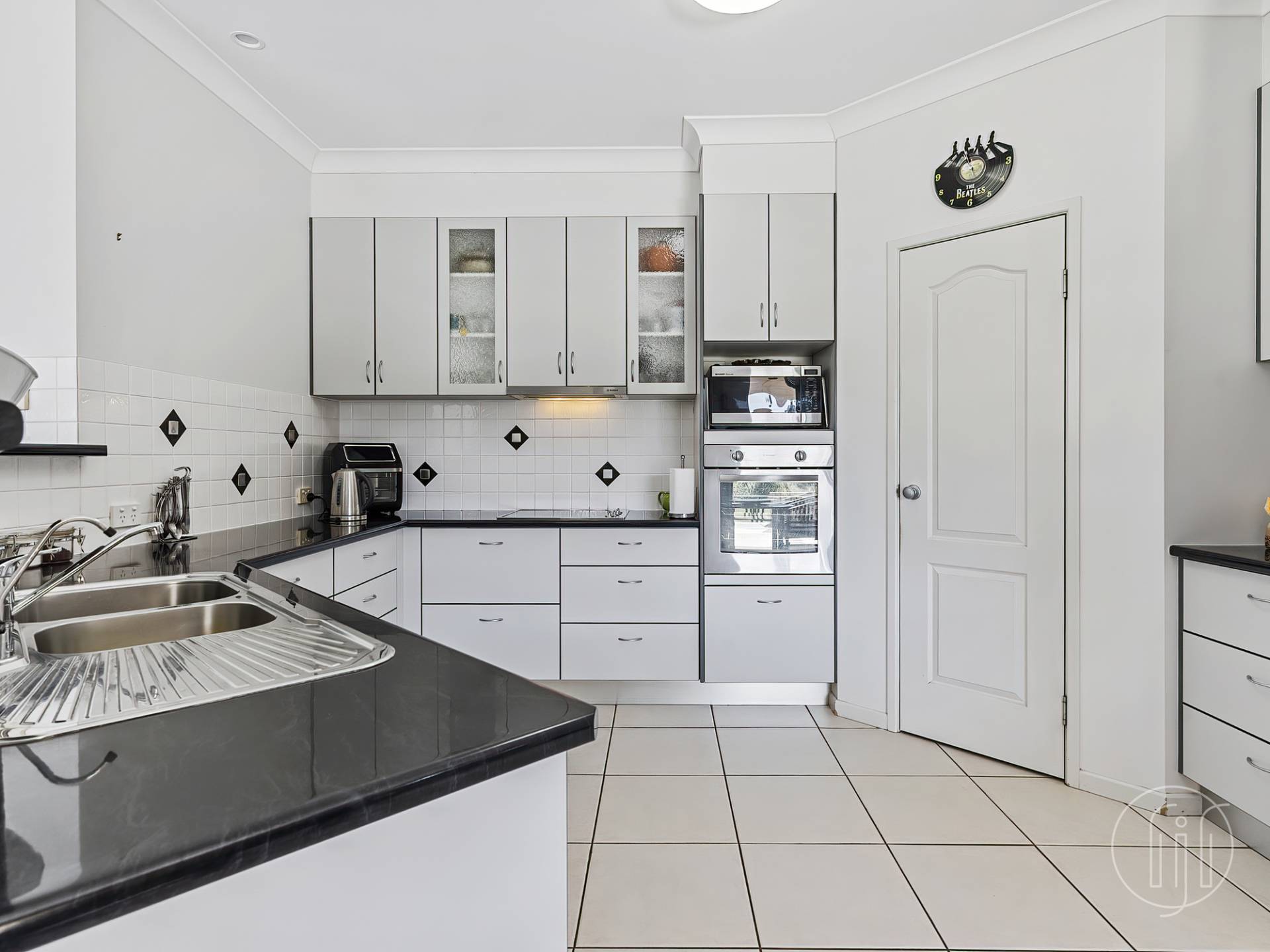 The kitchen is in the centre of the home and has a walk-in pantry, ample cupboards, electric cooking facilities and sliding doors out to the veranda.  There is a designated space here for a breakfast table or desk, and then the area opens out into the formal dining and lounge room – a generous room to accommodate a large dining table and lounge suite.